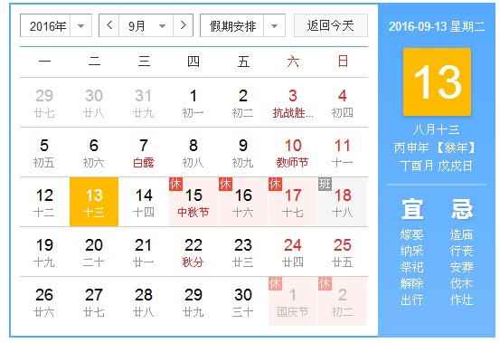 一、2016年中秋节假期共3天,从2016年9月15日至17日。其中,2016年9月18日(星期天)开始正常上班。