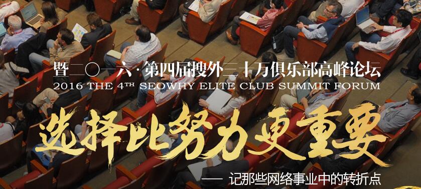 搜外三十万俱乐部高峰论坛的宗旨是扩展俱乐部成员的人脉资源和思维空间,实现从优秀到卓越的跨越,截至目前已经成功举办三届,本届定于2016年10月27-28日在武汉举办,主题是《选择比努力更重要 -- 记那些网络事业中的转折点》