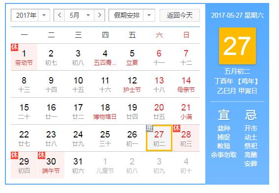 一、2017年端午节假期共3天,从2017年5月28日至2017年5月30日。其中,2017年5月31日(星期三)开始正常上班。