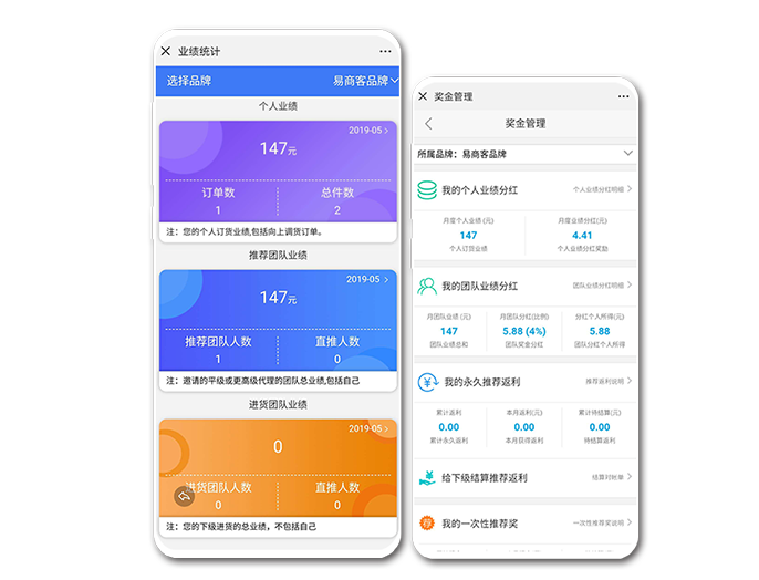 分红返利:个性化的业绩奖金分红管理系统,可完美匹配90%的微商政策和制度模式,根据制度规则个性化配置。对于部分不支持的规则也支持定制化设计(可能会收取一定的定制用费)。系统支持个人业绩分红、团队业绩分红、区域业绩分红、推荐永久返利、一次性推荐奖等分红奖金规则,可根据您的需求自由开启和配置。后合管理及代理可以清晰的查看相应的业绩分红和结算状态。支持系统自动结算、一键批量结算、线下结算等多种结算方式,让财务操作不再烦恼。
